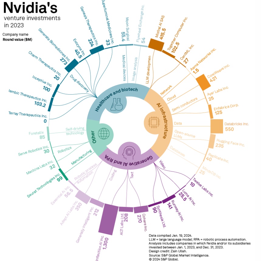 一举将英伟达捧上“算力之王”以及“全球最高市值芯片公司”这两大宝座的是旗下性能强劲的AI芯片以及尤其是其一手打造的CUDA运算平台风靡全球,可谓AI训练/推理等高性能计算领域首选的软硬件协同系统。但在过去两年间,英伟达旗下的风投部门将很大一部分资金投向了药物研发领域——单是在2023年,英伟达就投资了8家专注于药物研发领域的初创生物科技公司。