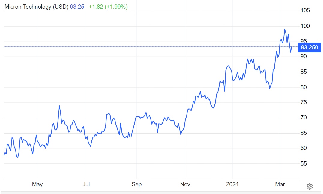 智通财经APP获悉,来自美国的存储芯片巨头美光科技(MU.US)将于美东时间3月20日发布2024财年第二季度财报,华尔街分析师们普遍预计美光DRAM存储芯片以及HBM存储系统营收的增长速度将有助于美光大幅缩小亏损,同时还将公布该芯片公司为全球AI芯片霸主英伟达(NVDA.US)所供应的绑定新款AI硬件系统的HBM存储的更详细细节。在美光公布业绩前夕,华尔街大行花旗重申对美光“买入”的评级,并将目标价从95美元大幅调高至150美元。美光一年来涨幅高达70%,上周收于93.25美元。