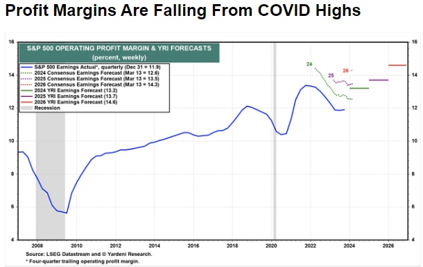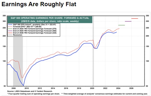 Yardeni Research的数据显示,自2022年以来,企业利润没有太大变化。收入增加了,但利润率下降了,利润率下降的一个关键原因是,现在几乎所有要再融资的债务的利率都要比以前高。利润率目前已停止下降,但没有迹象表明AI推动了利润率的增长。