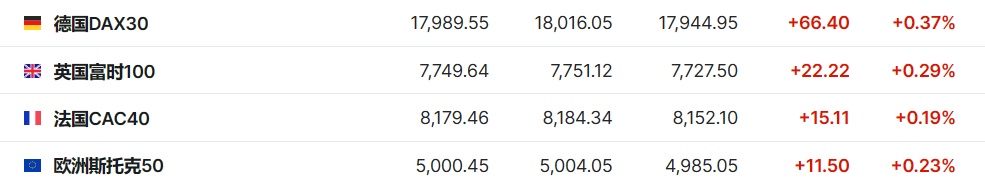 2.截至发稿,德国DAX指数涨0.37%,英国富时100指数涨0.29%,法国CAC40指数涨0.19%,欧洲斯托克50指数涨0.23%。