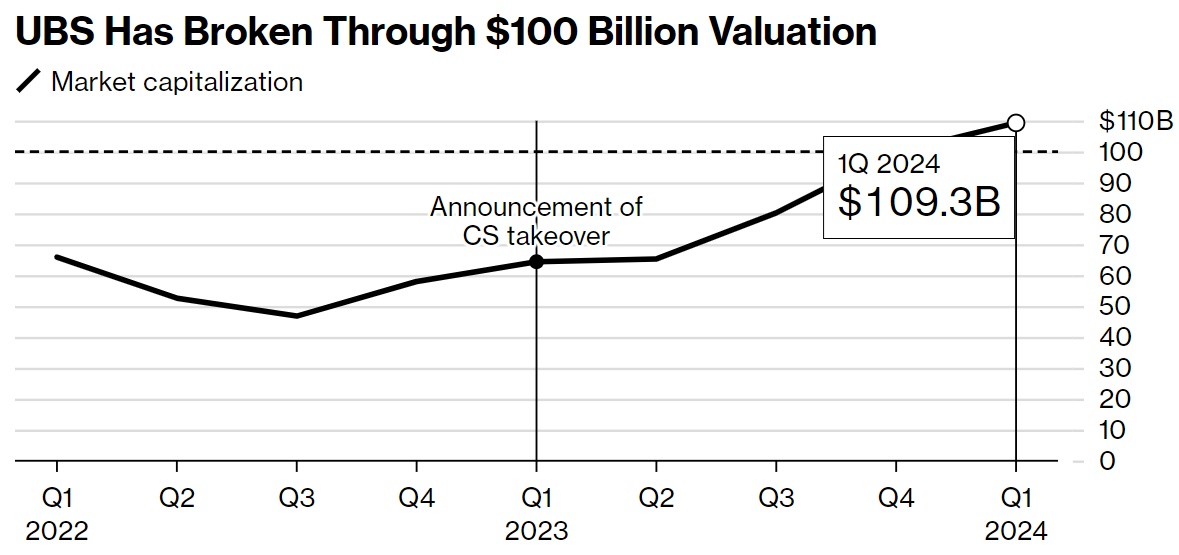 智通财经APP注意到,在瑞银集团(UBS.US)历史性收购前竞争对手瑞士信贷一周年之际,投资者越来越清楚地看到,这笔交易给瑞银带来了多大的好处。该公司市值超过1000亿美元,达到近16年来的最高水平,巩固了其在全球财富管理领域的领先地位。