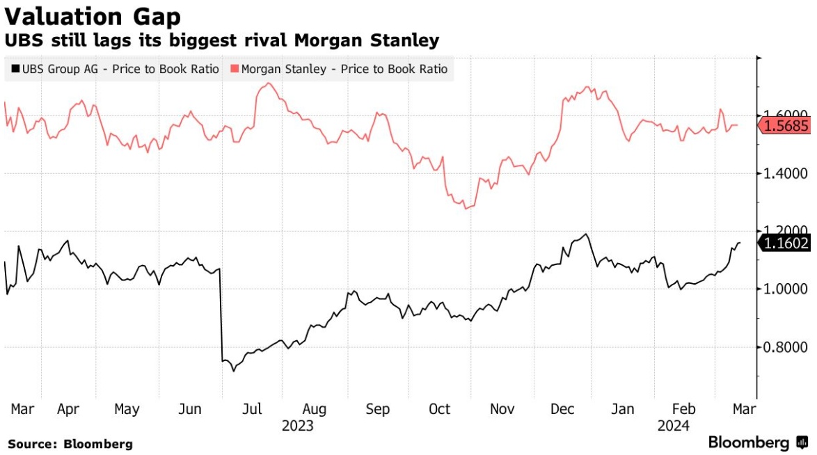 以所谓的市净率(price-to-book ratio)衡量,瑞银的估值仍远远落后于竞争对手。