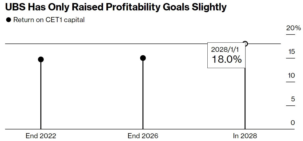 2023年最后两个季度的连续两次亏损,也将注意力集中在了盈利能力上。维权投资者Cevian Capital AB已大量持有瑞银股份,并表示将努力实现雄心勃勃的目标。今年2月,瑞银承诺到2028年实现CET1的监管资本回报率达到18%,但这一承诺在推出时并未令分析师感到兴奋。
