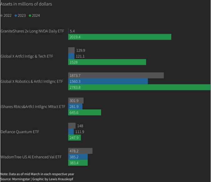 这些基金涵盖范围广泛,从投资最大的人工智能赢家,到机器人技术和声音生成等更深奥的主题。晨星公司的数据显示,截至2月底,在美国交易的人工智能主题ETF总额已从一年前的25.5亿美元飙升至68.8亿美元。