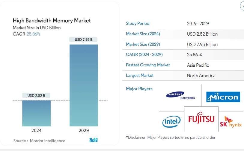 知名研究机构Mordor Intelligence预测数据显示,HBM存储产品的市场规模预计将从 2024年的约 25.2 亿美元激增至 2029年的 79.5 亿美元,预测期内(2024-2029年)复合年增长率高达 25.86%。