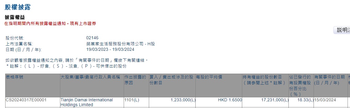 Limited增持荣万家(02146)123.3万股,每股作价1.65港元,总金额为203.445万港元。增持后最新持股数目为1723.1万股,最新持股比例为18.33%。