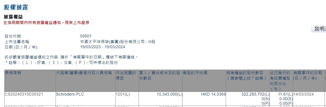 PLC减持中国太保(02601)1534.3万股,每股作价14.0369港元,总金额约为2.15亿港元。减持后最新持股数目约为3.22亿股,最新持股比例为11.61%。