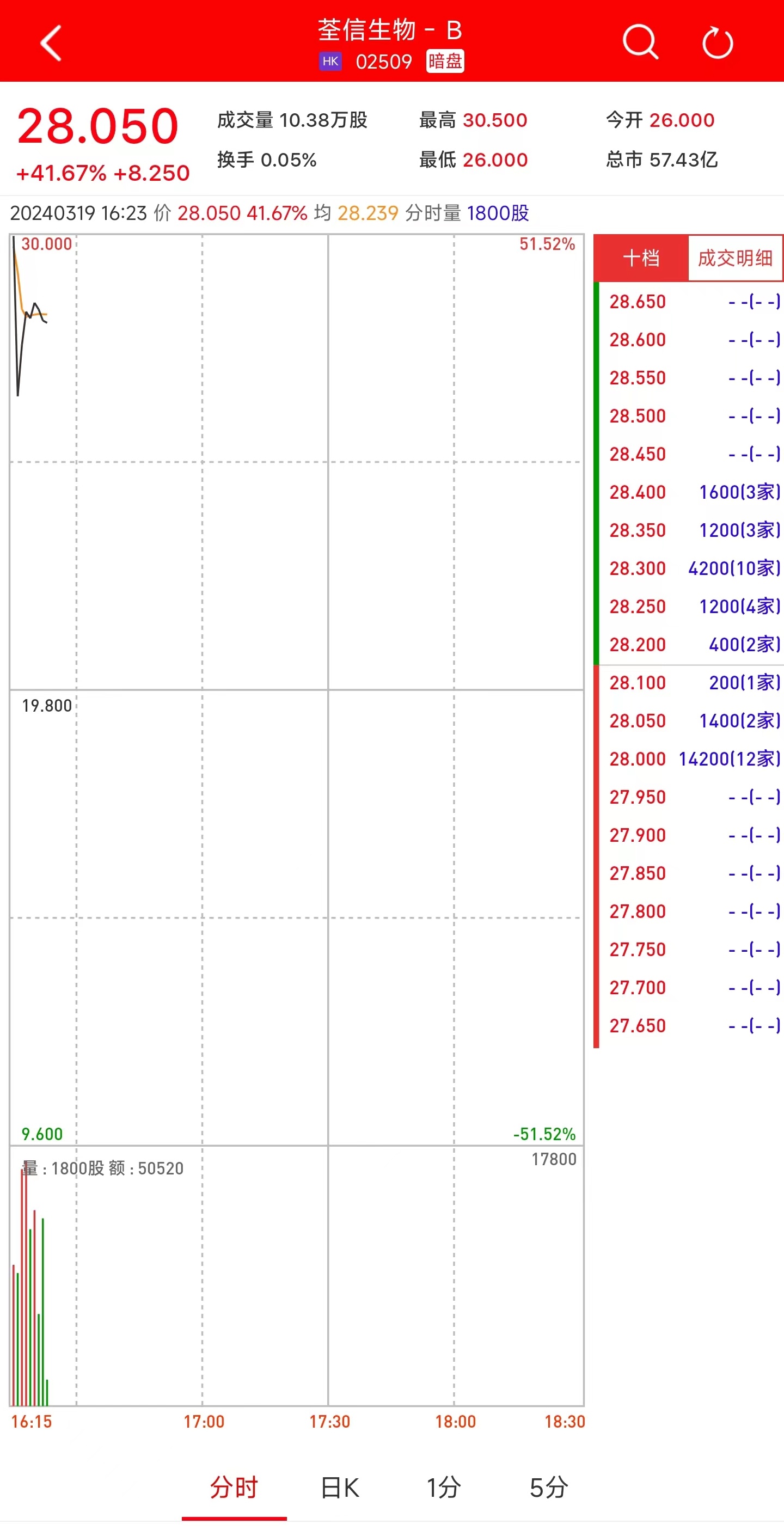 智通财经APP获悉,荃信生物-B(02509)将于3月20日(周三)在香港挂牌。截至发稿,利弗莫尔证券暗盘交易显示报价28.05港元,较招股价19.8港元上涨41.67%。每手200股,不计手续费,每手赚1650港元。