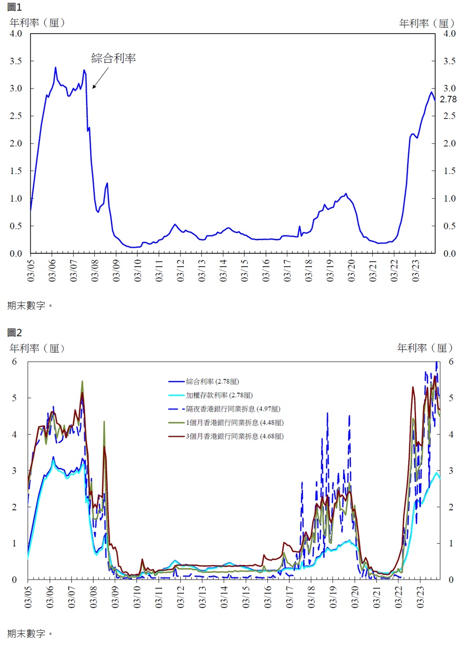 智通财经APP获悉,3月19日,香港金融管理局公布2024年2月底综合利率。反映银行平均资金成本的综合利率在2024年2月底为2.78厘,较2024年1月底的2.87厘下跌9基点(见附件图1)。综合利率下跌,反映月内存款及银行同业资金的加权资金成本减少。