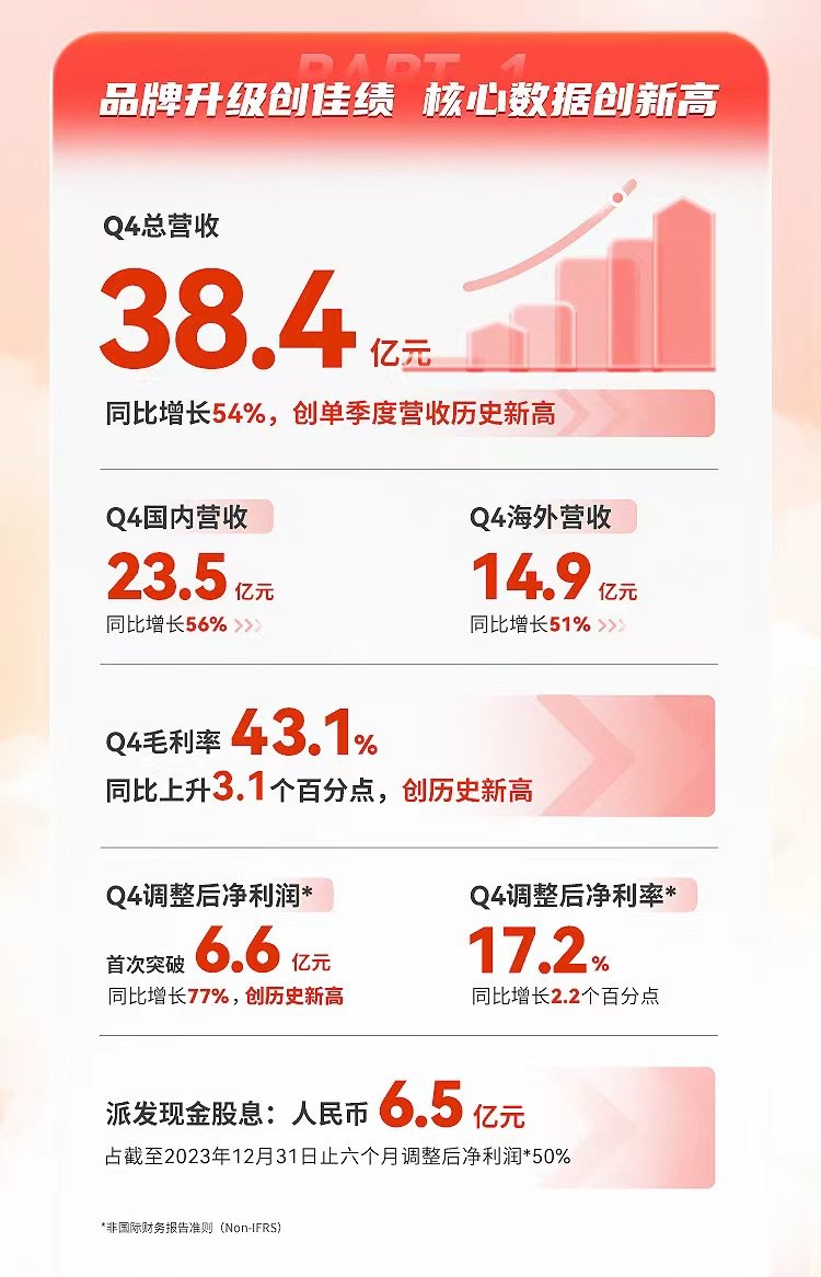 在截至2023年12月31日的6个月内,公司营收为76.32亿元,同比增长约45%;调整后净利润为13.03亿元,同比增长约65%。同时,董事会宣布派发特别现金股息每股普通股0.0725美元,约合人民币6.5亿元,约占截至2023年12月31日止六个月调整后净利润的50%,以实际行动回馈股东。