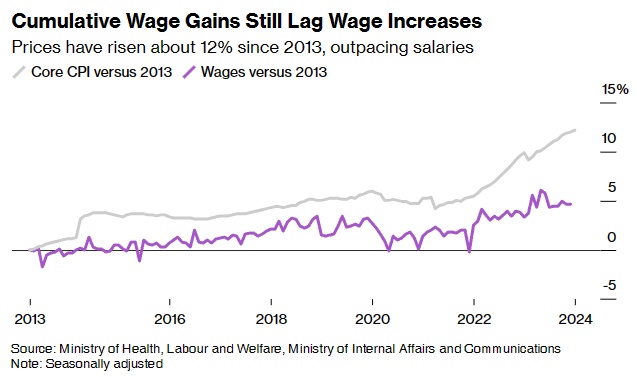 自2013年以来,日本物价上涨了约12%,超过了工资涨幅