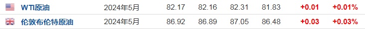 3.截至发稿,WTI原油涨0.01%,报82.17美元/桶。布伦特原油涨0.03%,报86.92美元/桶。