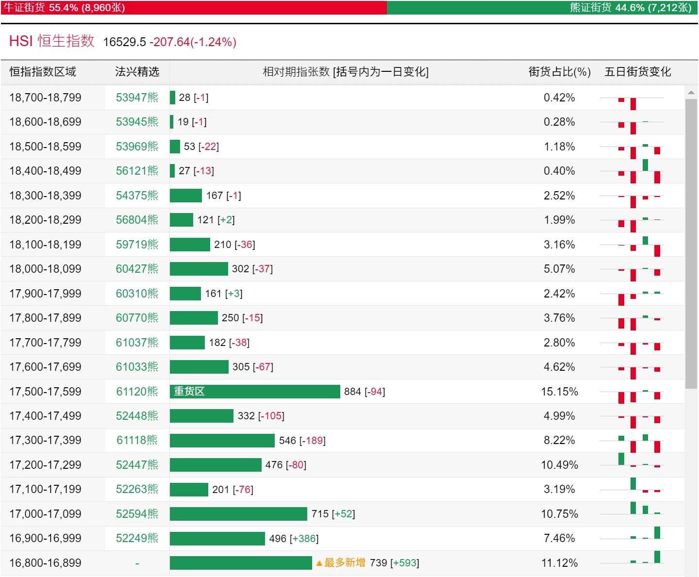 法兴恒指牛熊证街货分布图中的数据显示,熊证街货重货区在17500-17599区间,该区间最新熊证数量为884张,较上一交易日减少94张;最多新增在16800-16899区间,该区间最新熊证数量为739张,较上一交易日增加593张。