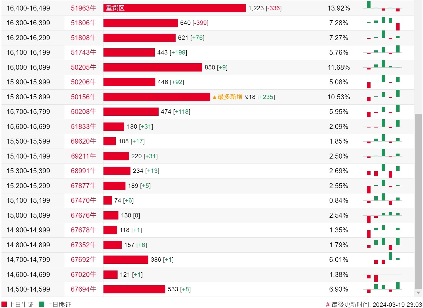 牛证街货重货区在16400-16499区间,该区间最新牛证数量为1223张,较上一交易日减少336张;最多新增在15800-15899区间,该区间最新牛证数量为918张,较上一交易日增加235张。