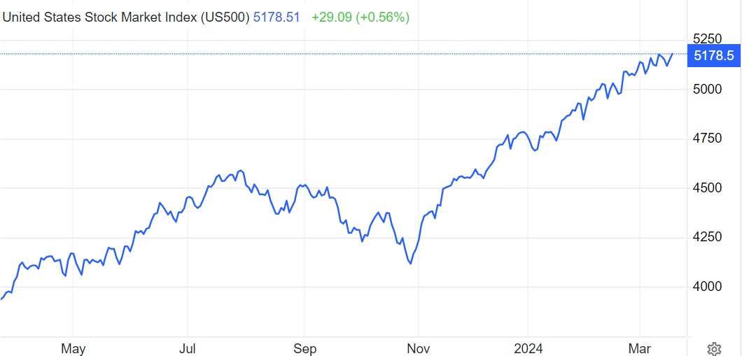标普500指数在今年历史上首次突破5,100点这一的重要里程碑,该指数已经超过了华尔街分析师们平均预测的年终点位4,962点,截至周二美股收盘,标普500指数创收盘历史新高5178.51点。该指数在2023年上涨24%之后,今年年初上涨超8%且屡创新高,华尔街进而开始争论股市是否将因“科技股泡沫破裂”出现剧烈的暴跌趋势。