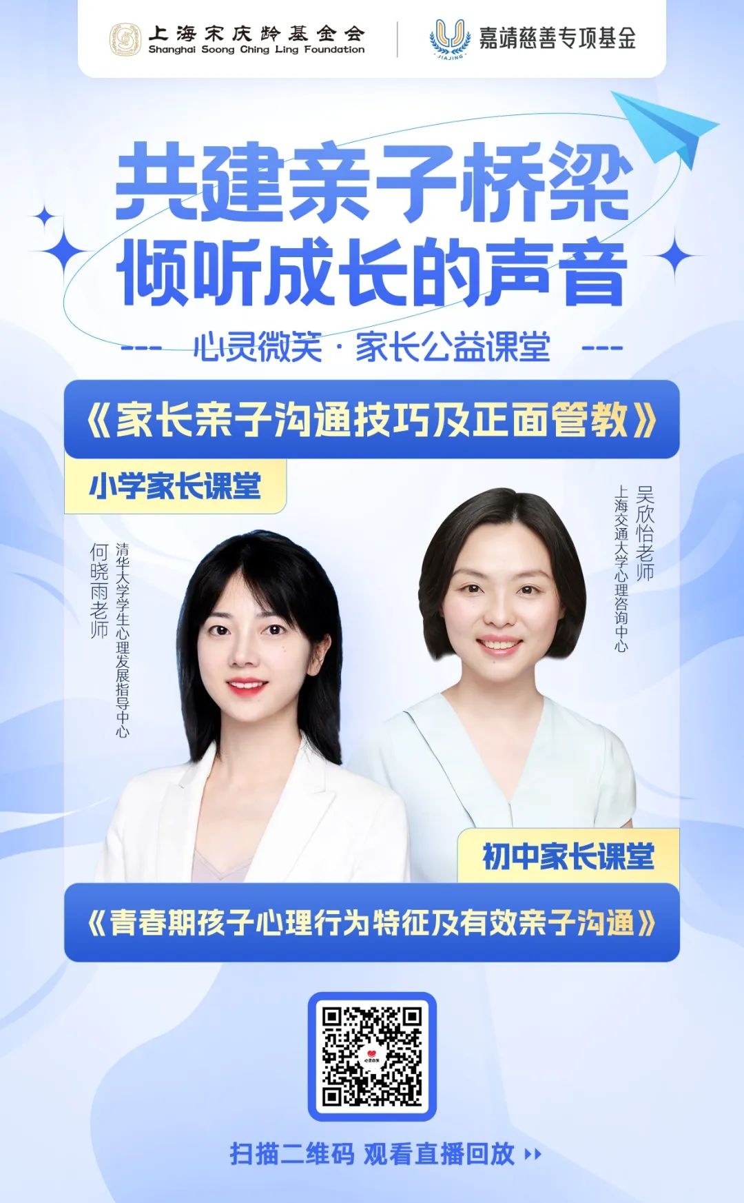 近日,由嘉银科技(JFIN.US)支持的嘉靖慈善专项基金先后邀请清华大学和上海交通大学心理中心专家,分别面向小学和初中家长,围绕亲子关系开展了两场家长公益课堂直播。数据显示,两场讲座累计观看量约5万,互动点赞量超64万。