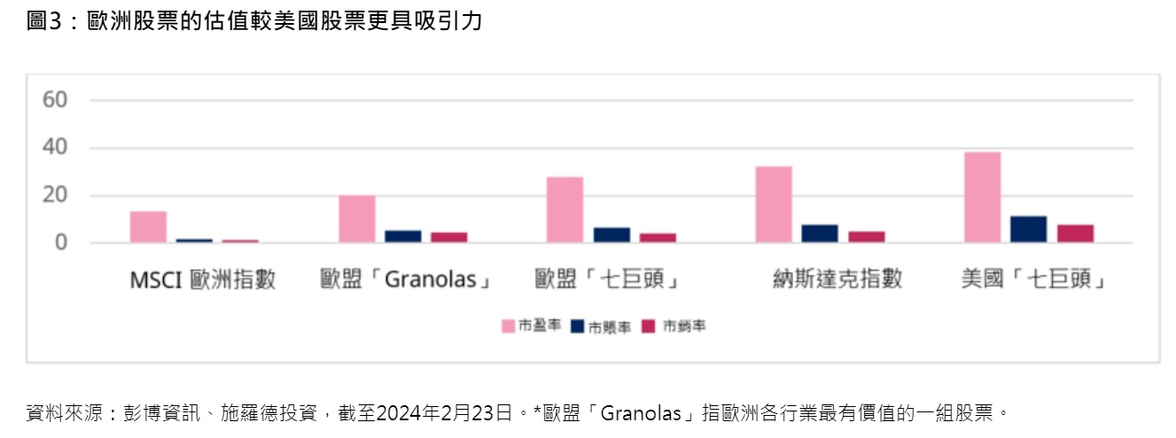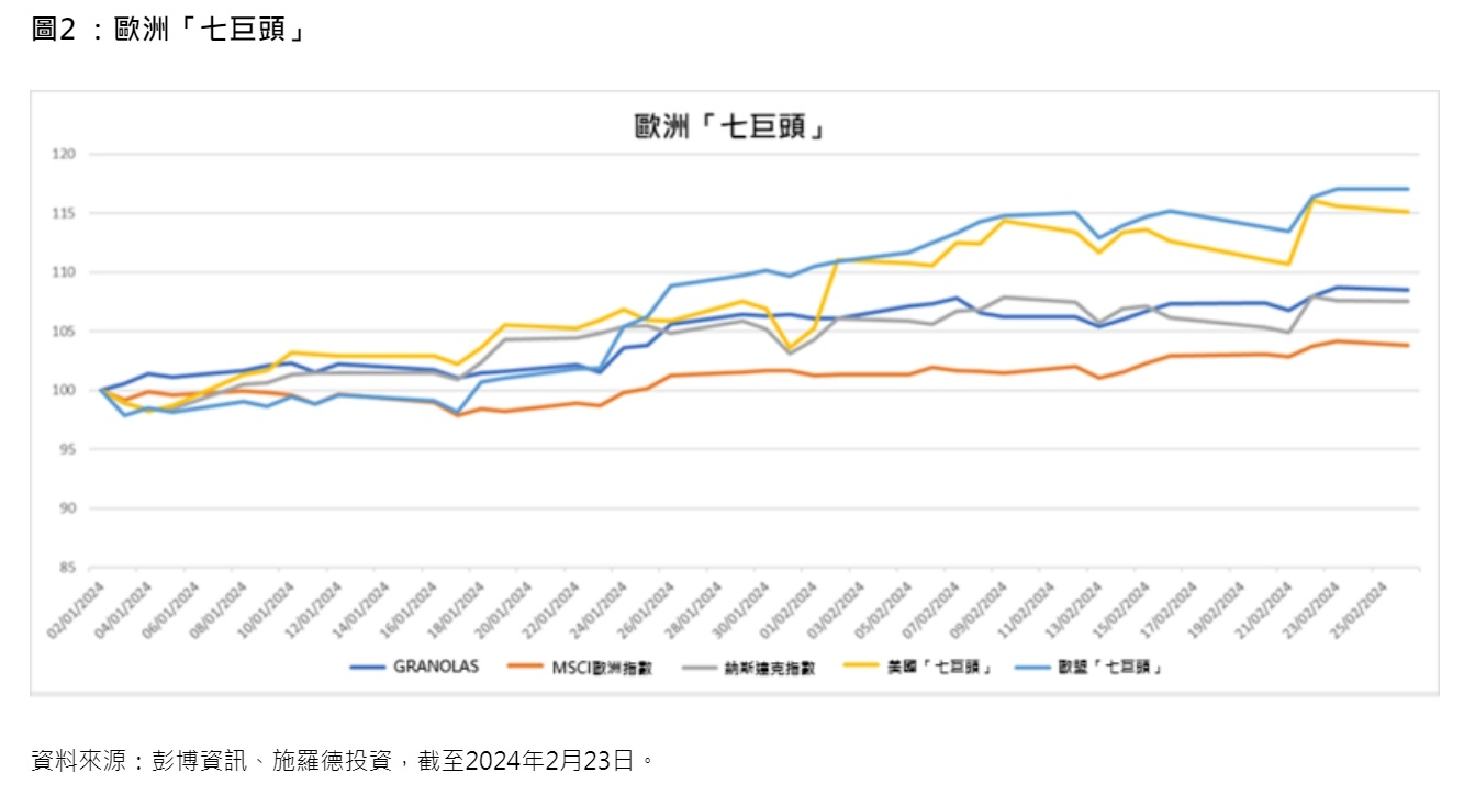 从估值角度来看,欧洲的情况较为有利,而经济及盈利增长预期明显偏低。然而,值得留意的是,欧洲并未完全摆脱美国股市一度所见的情况,即是只有市场的某部分领域带领整个美国股票市场,比如美国科技“七巨头”。施罗德投资设定的欧洲“七巨头”(Magnificent 7) 组合,在过去两年的表现与美国“七巨头”持平。