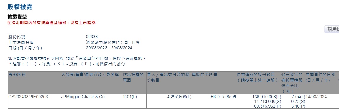 智通财经APP获悉,香港联交所最新资料显示,3月14日,小摩增持潍柴动力(02338)429.7608万股,每股作价15.6599港元,总金额约为6730.01万港元。增持后最新持股数目约为1.37亿股,最新持股比例为7.04%。