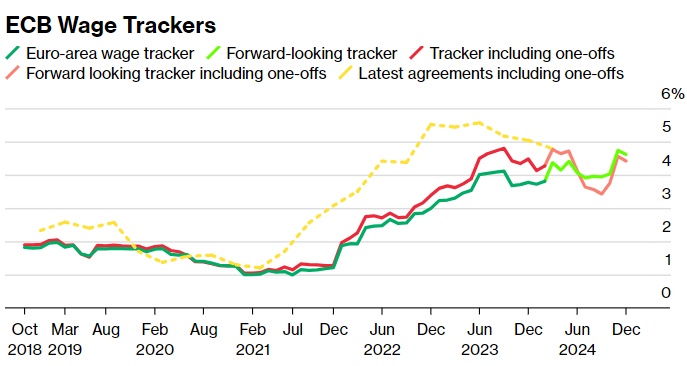 如果市场对6月份的押注被证明是正确的,基于追踪指标出现的时间,那么欧洲央行降息周期的开始时也将具有更高的可视性。欧洲央行与各成员国央行共同制定了这些措施,以弥补该地区缺乏连贯和及时的数据。如果没有这些数据,政策制定者将面临一类他们认为对评估通胀至关重要的信息的缺失。这些关于工资和劳动力成本的数据可能表明,强劲的工资增长是否有可能导致价格更快上涨。