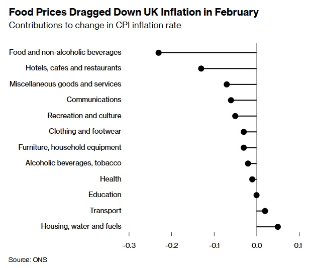 英国国家统计局表示,食品价格、餐馆和咖啡馆成本的下降帮助拉低了通胀,但汽车燃料、住房和家庭服务给通胀带来了上行压力。数据显示,食品和非酒精饮料价格上涨5%,创俄乌冲突以来的最低水平,远低于1月的6.9%;餐馆和酒店的通胀率则从1月的7.1%降至2月的6%。
