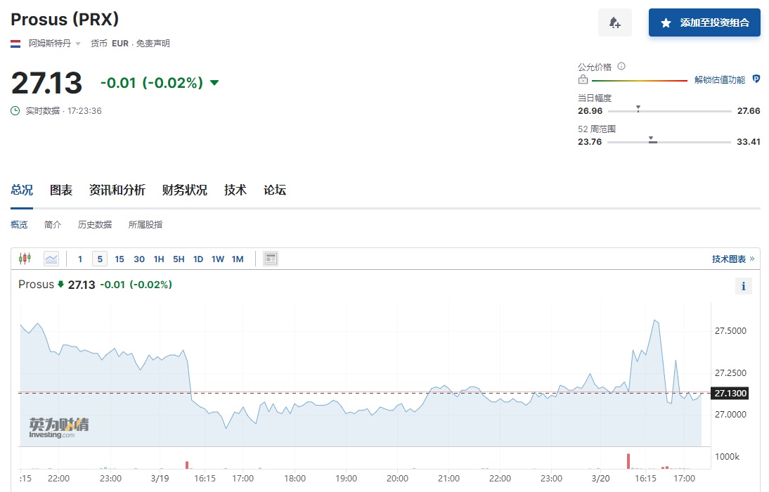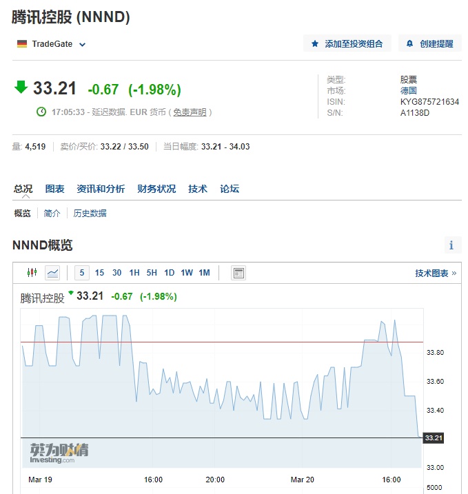 智通财经APP获悉,3月20日盘后,腾讯控股(00700)公布2023年第四季度及全年业绩数据。其中,腾讯去年第四季度营收约1552亿元人民币,预估为1574.2 亿元人民币,上一年同期1449.54亿元;腾讯去年第四季度净利润270.25亿元人民币,市场预期332.9亿元人民币。财报公布后,德国法兰克福市场上,腾讯控股下跌1.98%,报33.21欧元,折合约281.95港元,较港股收盘价288.80港元跌约2.37%。在荷兰阿姆斯特丹市场上,腾讯最大股东Naspers集团旗下子公司Prosus下跌0.02%,报27.13欧元。