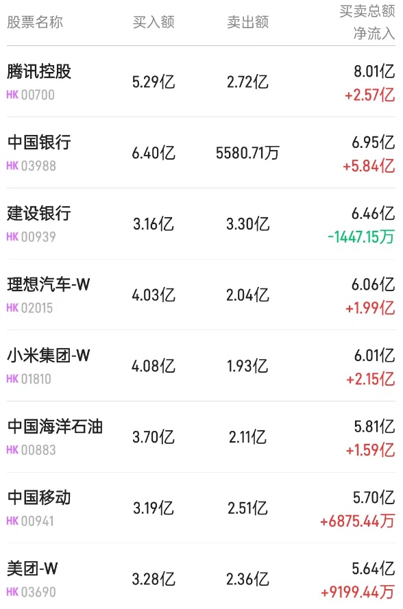 北水净买入最多的个股是中国银行(03988)、腾讯(00700)、小米集团-W(01810)。北水净卖出最多的个股是中国神华(01088)、建设银行(00939)。
