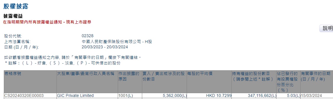 Limited增持中国财险(02328)536.2万股,每股作价10.7299港元,总金额约为5753.37万港元。增持后最新持股数目约为3.47亿股,最新持股比例为5.03%。