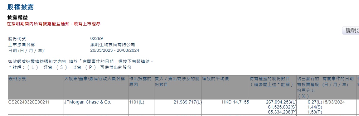 智通财经APP获悉,香港联交所最新资料显示,3月15日,小摩增持药明生物(02269)2198.9717万股,每股作价14.7155港元,总金额约为3.24亿港元。增持后最新持股数目约为2.67亿股,最新持股比例为6.27%。