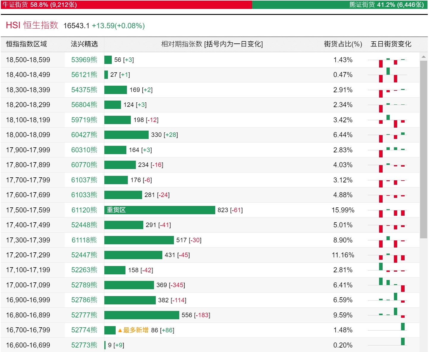 法兴恒指牛熊证街货分布图中的数据显示,熊证街货重货区在17500-17599区间,该区间最新熊证数量为823张,较上一交易日减少61张;最多新增在16700-16799区间,该区间最新熊证数量为86张,较上一交易日增加86张。