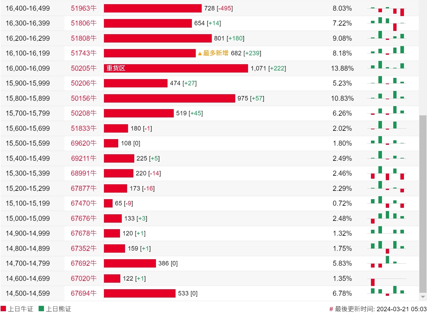 牛证街货重货区在16000-16099区间,该区间最新牛证数量为1071张,较上一交易日增加222张;最多新增在16100-16199区间,该区间最新牛证数量为682张,较上一交易日增加239张。