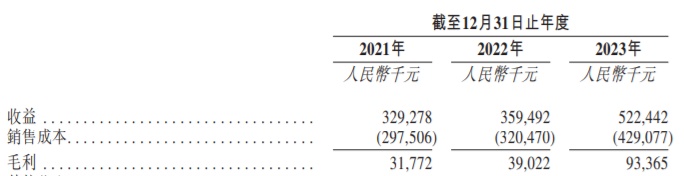财务方面,于2021年度、2022年度及2023年度,公司收益分别约为人民币3.29亿元、3.59亿元及5.22亿元;同期,毛利分别约为人民币3177.2万元、3902.2万元及9336.5万元。