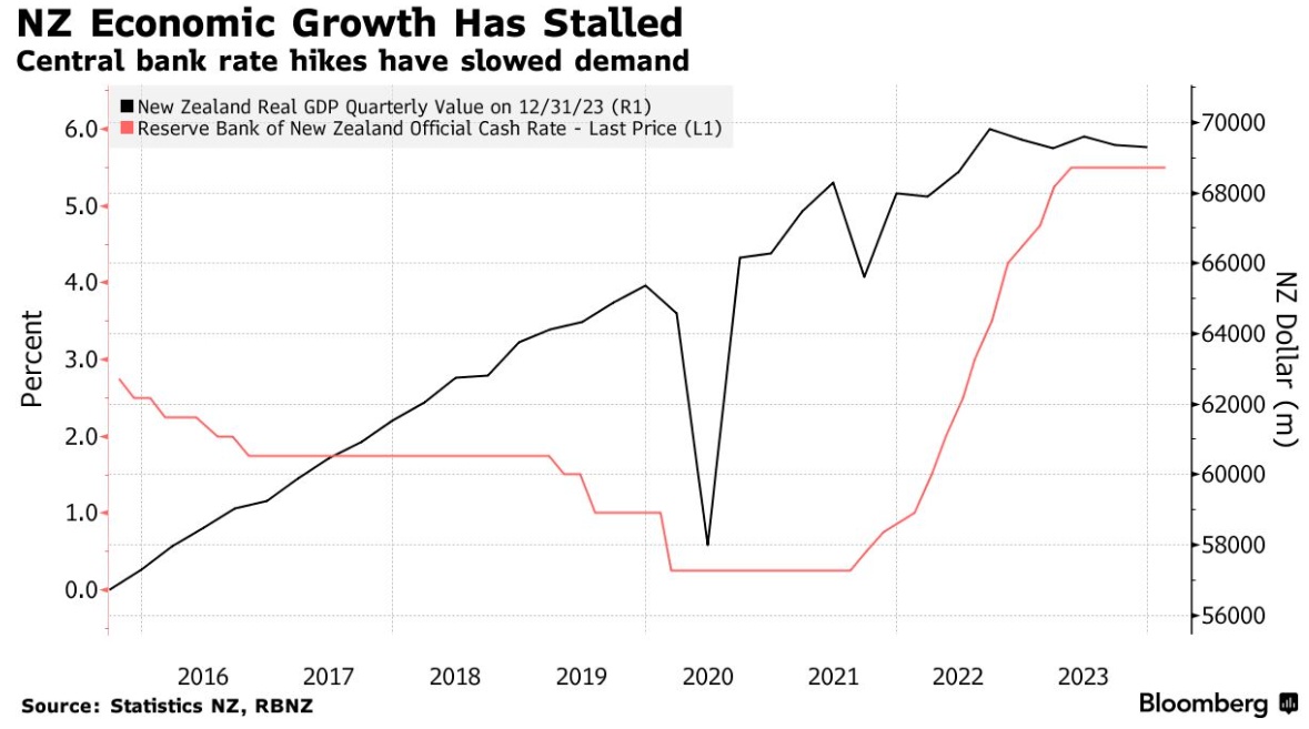 在新西兰联储试图控制通胀的激进货币政策收紧下,该国经济已陷入双底衰退。疲弱的经济增长可能会加大政策制定者的压力,迫使他们考虑提前转向降息。