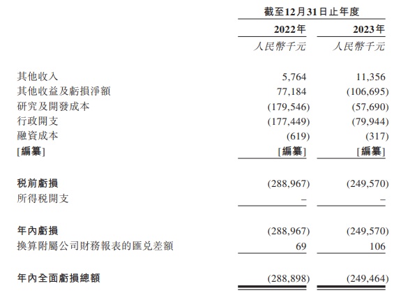 财务方面,于2022、2023年,公司的全面亏损总额分别约为2.89亿及2.49亿元。同期,公司的研发成本分别约为1.80亿元及5769万元。
