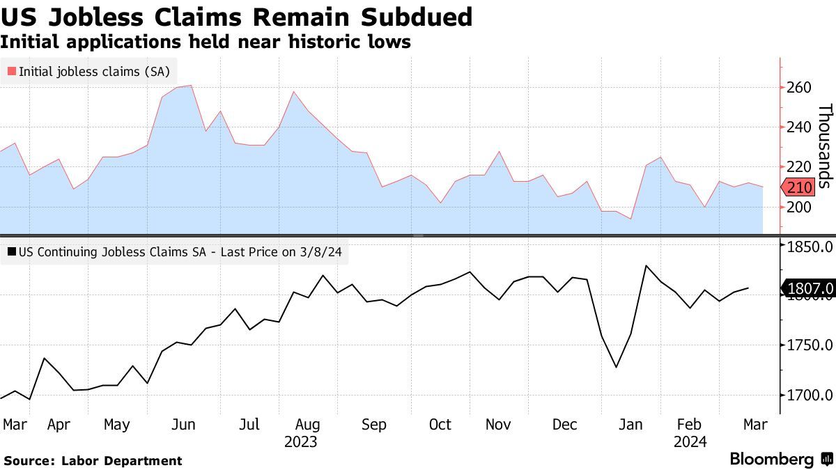 智通财经APP获悉,美国上周初请失业金人数维持在历史低位附近,突显出劳动力市场仍具弹性。美国劳工部周四公布的数据显示,美国截至3月16日当周初请失业金人数为21万,低于市场预期的21.5万,略高于上周的20.9万。