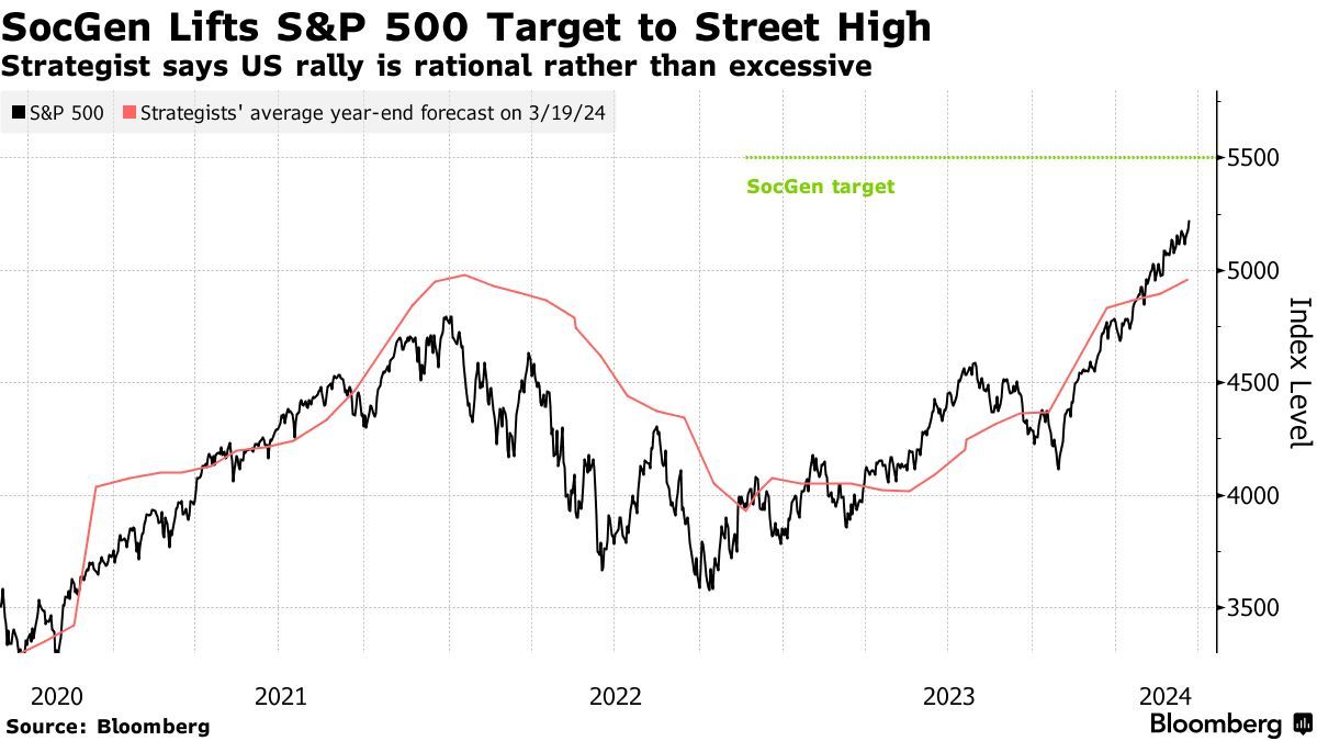 Kabra表示,在企业盈利前景改善和人工智能热潮的背景下,美国股市创纪录的上涨势头不可阻挡。策略师将其对标普500指数在2024年底的目标点位由4750点上调至5500点,较当前水平上涨5%以上。这是华尔街策略师给出的最高点位预测。