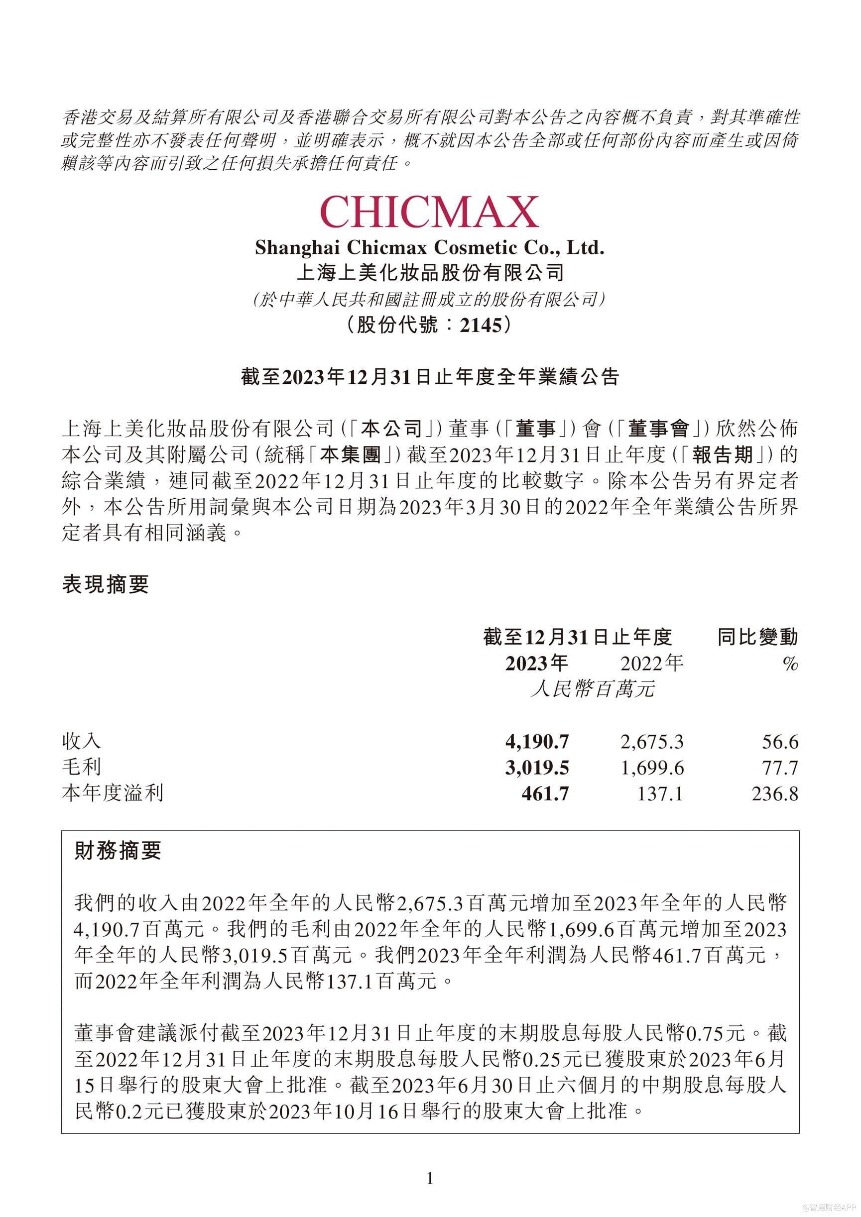 2024年3月21日,上美化妆品股份有限公司(证券简称:上美股份 证券代码:02145)发布2023年度业绩公告,整体营收、利润双增。业绩公告显示,2023年全年上美股份营业收入为41.91亿元,同比增长56.6%;归母净利润为4.61亿元,同比增长213.5%;毛利为30.19亿元,同比增长77.7%;毛利率为72.1%,较2022年增长8.6个百分点。