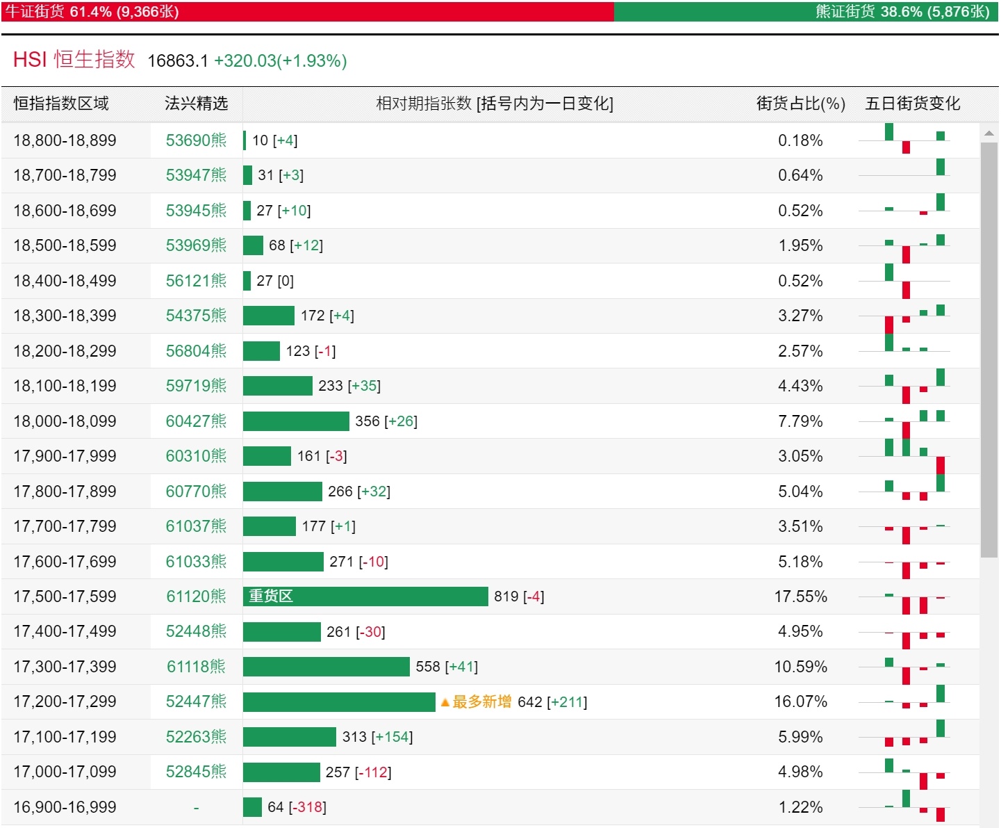 法兴恒指牛熊证街货分布图中的数据显示,熊证街货重货区在17500-17599区间,该区间最新熊证数量为819张,较上一交易日减少4张;最多新增在17200-17299区间,该区间最新熊证数量为642张,较上一交易日增加211张。