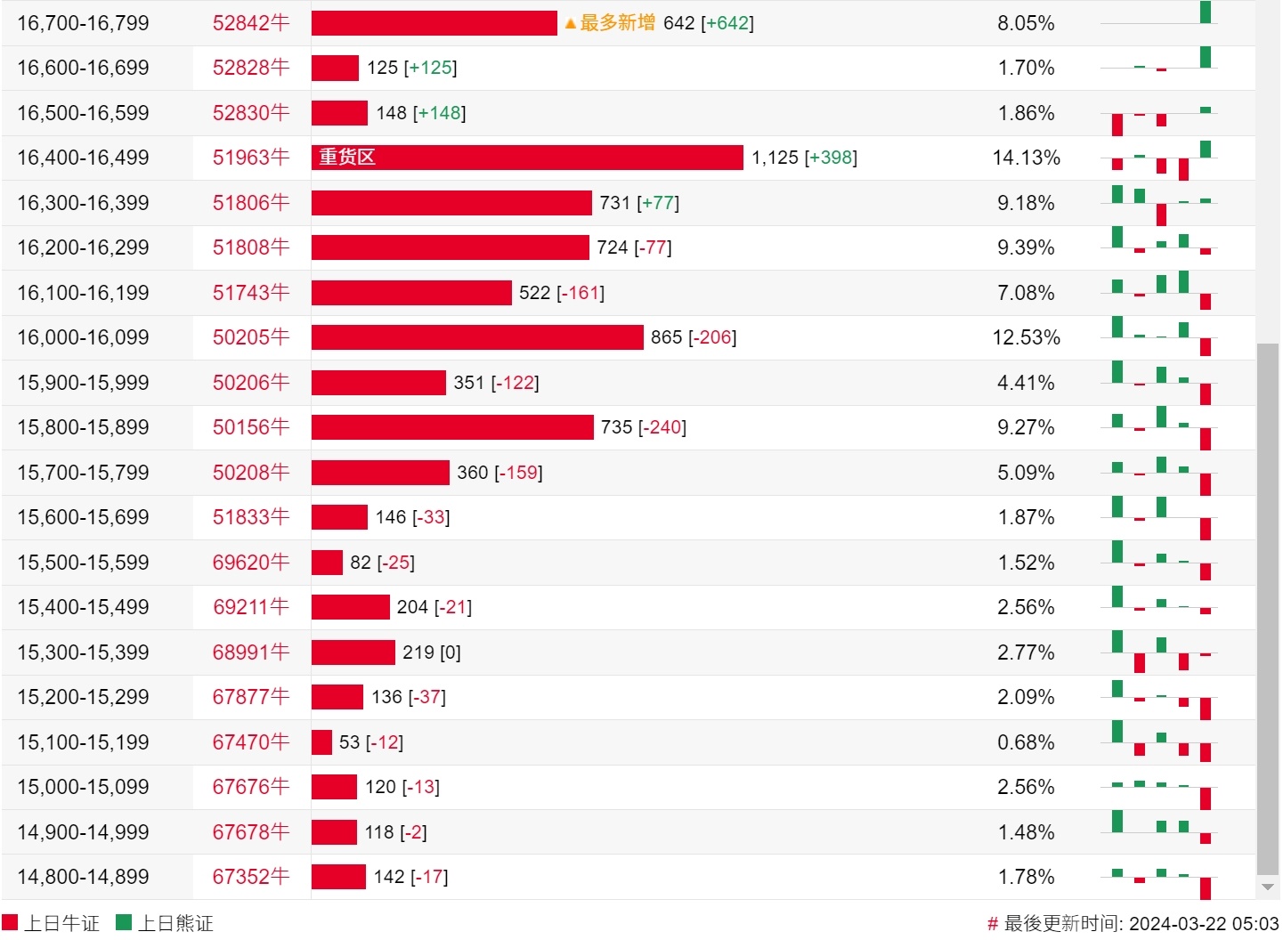 牛证街货重货区在16400-16499区间,该区间最新牛证数量为1125张,较上一交易日增加398张;最多新增在16700-16799区间,该区间最新牛证数量为642张,较上一交易日增加642张。