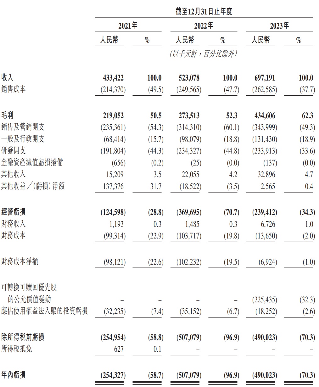 财务方面,于2021年度、2022年度及2023年度,公司收入分别约为人民币4.33亿元、5.23亿元及6.97亿元;同期,年内亏损分别约为人民币2.54亿元、5.07亿元及4.9亿元。