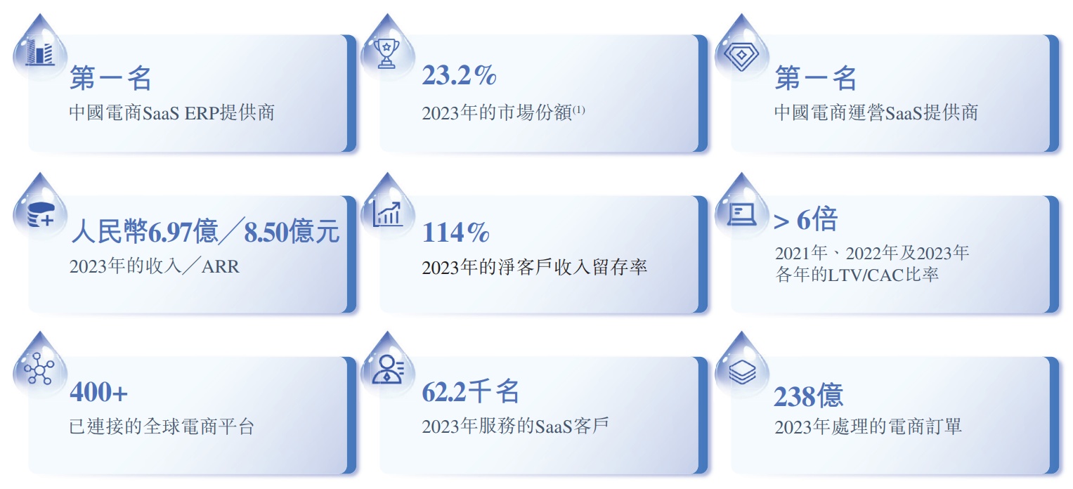 根据灼识咨询的资料,2023年中国电商SaaS ERP市场的规模(按商家支出计)为人民币26亿元。在中国电商运营SaaS市场中,按 2023年SaaS总收入计,公司同样排名第一,市场份额为7.5%。