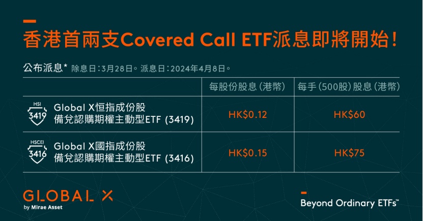 智通财经APP获悉,未来资产香港Global X ETFs宣布旗下两只备兑认购期权(Covered Call)策略ETF——Global X恒指成份股备兑认购期权主动型ETF(03419)以及Global X国指成份股备兑认购期权主动型ETF (03416)即将开始派息。上述两只备兑认购期权策略ETF除息日为3月28日,派息日为4月8日。