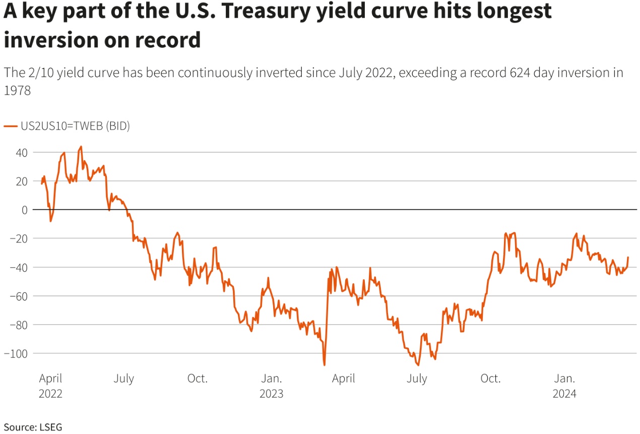 自2022年7月初以来,两年期和十年期美债收益率曲线的部分一直倒挂,这意味着短期债券的收益率高于长期债券。德意志银行周四在一份报告中称,这超过了1978年创下的624天反转纪录。