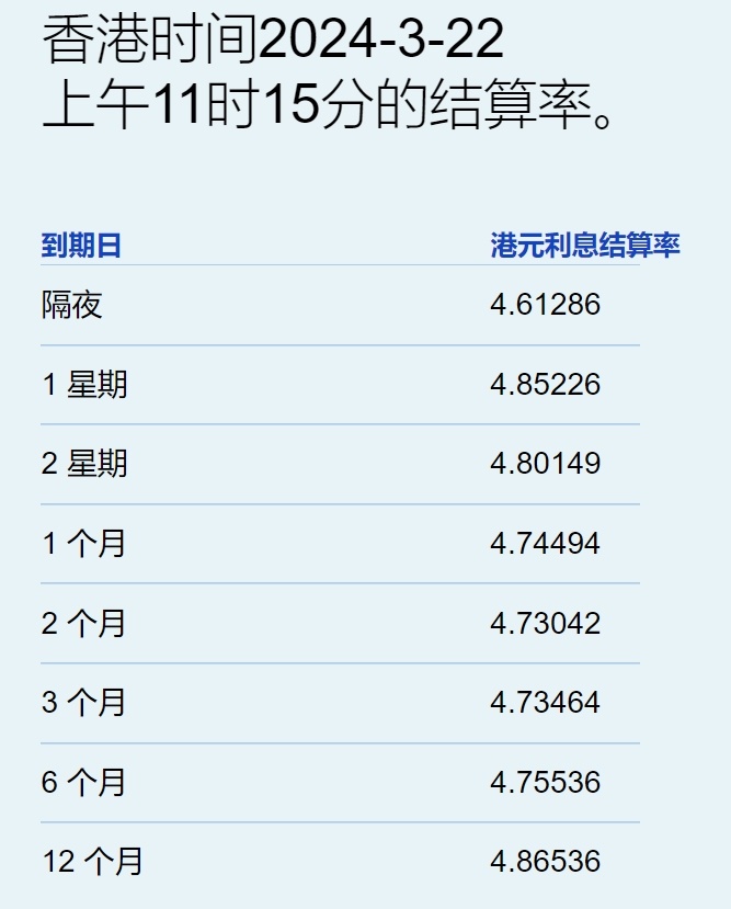 智通财经APP获悉,美国议息后决定维持利率不变后,港元拆息连续2日全线上扬。其中,隔夜息升近20基点报4.61286%,创逾三周新高。一周拆息涨41基点至4.85226%。与楼按相关的一个月拆息报4.74494%,创四周新高。反映银行资金成本的三个月拆息三连升报4.73464%,为1月24日以来最高。六个月及一年期分别报4.75536%和4.86536%。