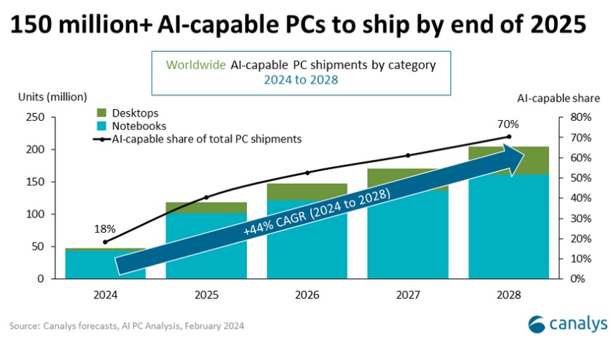 Canalys最新预测数据显示,2024年,全球AI PC出货量将达到4800万台,占个人电脑(PC) 总出货量的18%。但这仅是市场转型的开始,预计到2025年,AI PC出货量将超过1亿台,占PC总出货量的40%。预计到2028年,AI PC出货量将达到惊人的2.05亿台,2024年至2028年期间的复合年增长率(CAGR)预计将达到惊人的44%。