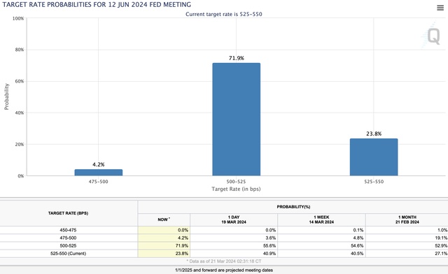 在美联储公布利率决议之后,市场目前预计,美联储在6月至少降息25个基点的可能性约为76%,高于公布利率决议之前的60%左右。因此,市场预期正朝着更快降息的方向发展,而不是此前预期的在更长时间内维持高利率。此外,市场认为,美联储在7月或之前降息的可能性已经接近90%,甚至有大约40%的可能性在7月底之前出现两次降息。