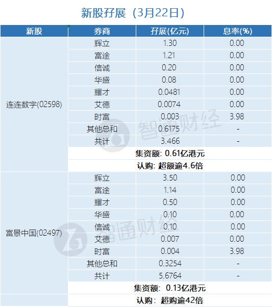 智通财经APP获悉,连连数字(02598)、富景中国(02497)正在招股中。截至3月22日,辉立、富途、华盛等券商合计为连连数字和富景中国分别借出孖展3.466亿港元、5.6764亿港元,超购分别逾4.6倍和42倍。