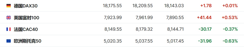 2.截至发稿,德国DAX指数涨0.01%,英国富时100指数涨0.53%,法国CAC40指数跌0.37%,欧洲斯托克50指数跌0.63%。