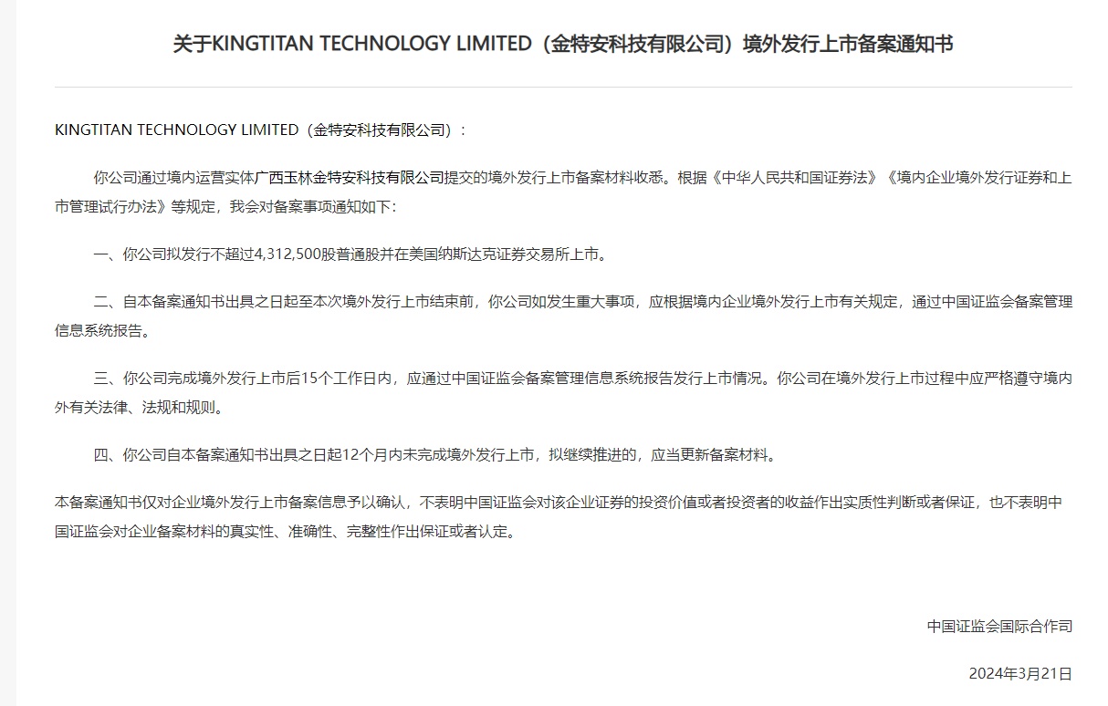 智通财经APP获悉,3月21日,中国证监会发布关于KINGTITAN TECHNOLOGY LIMITED(金特安科技有限公司)境外发行上市备案通知书。公司通过境内运营实体广西玉林金特安科技有限公司提交的境外发行上市备案材料已获收悉,并拟发行不超过4,312,500股普通股并在美国纳斯达克证券交易所上市。