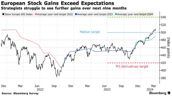 截至发稿,泛欧斯托克600指数下跌0.16%,该基准指数触及509点,根据彭博社对16位策略师的调查,相比该指数2024年末的预期中值高出约2%。
