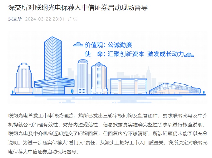智通财经APP获悉,3月22日晚间,深交所披露,联纲光电首发上市申请受理后,深交所已发出三轮审核问询及监管函件,要求联纲光电及中介机构就公司治理有效性、财务内控规范性、信息披露真实准确完整性等事项进行核查说明。联纲光电及中介机构近期提交了问询回复,但回复内容不够清晰,所涉问题仍未能予以充分说明。为进一步压实保荐人“看门人”责任,从源头上把好上市入口质量关,深交所决定对联纲光电保荐人中信证券(600030.SH,06030)启动现场督导。